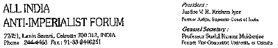 The meeting of the All India Anti-Imperialist Forum on the 16th of November 1997 attended by delegates from all over India and also from abroad took serious notice of the growing and dangerous repression affecting people from various political and social strata in Germany. The participants of the meeting were strongly concerned about the unjustified witch-hunt and illegal prosecution of political and state representatives of the former German Democratic Republic. The meeting therefore strongly demanded the immidiate and unconditional release from prison of the former GDR Defense Minister Heinz kessler, the former Commander of the GDR Border-Troops Baumgarte, the "Agent for Peace" Rainer Rupp and all political prisoners in German Jails. The participants of the meeting of the All India Anti-Imperialist Forum Übersetzung Die Konferenz des Allindischen Anti-Imperialistischen Forums am 16. November 1997 mit Delegierten aus ganz Indien und auch aus dem Ausland nahm mit Besorgnis Kenntnis von der wachsenden und gefährlichen Repression, von der in Deutschland Menschen verschiedener politischer und sozialer Schichten betroffen sind. Die Teilnehmer der Konferenz waren sehr beunruhigt über die ungerechtfertigte Hexenjagd auf und illegalen Anklagen gegen politische und staatliche Repräsentanten der früheren Deutschen Demokratischen Republik. Deshalb verlangte die Konferenz mit Nachdruck die unverzügliche und bedingungslose Freilassung des früheren Verteidigungsministers der DDR Heinz Keßler, des früheren Kommandanten der DDR-Grenztruppen Baumgarte, des "Kundschafters des Friedens" Rainer Rupp aus dem Gefängnis und aller politischen Gefangenen in deutschen Gefängnissen. Die Teilnehmer der Konferenz des Allindischen Anti-Imperialistsichen Forums |