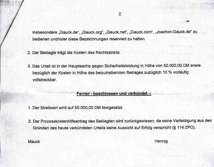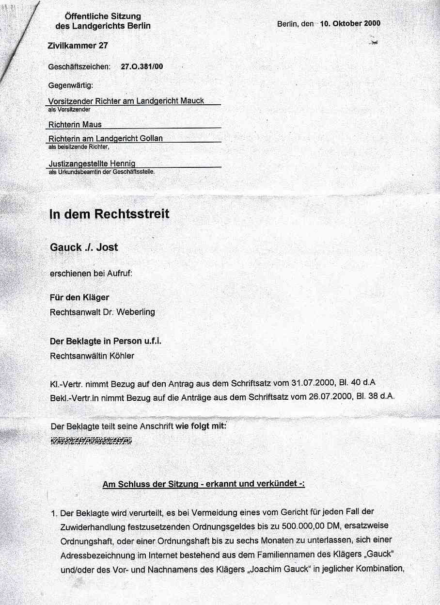 Part 1 Today, Tuesday, 10. October 2000, the court in Berlin has ruled that I do not have a right to own or to appear in the Internet under a domain name with "gauck" in it. I believe that the organization that he led (called unofficially the "Gauck Officials") has been responsible for the suicide of many people, and is thus worthy of public criticism, which constitutes my interest in using the catch phrase Gauck.xxx as an internet domain name. Below the court ruling against me.