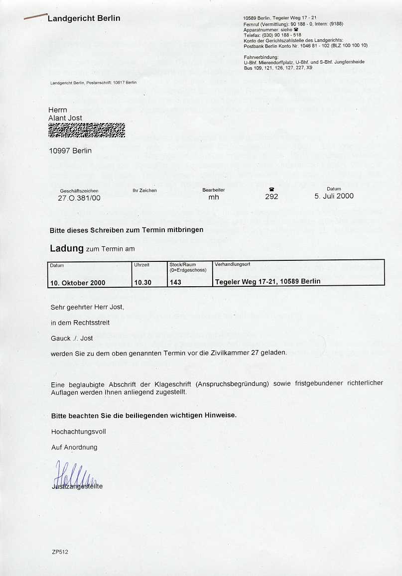 Some good news. I'm finally getting a "day in court". Following is a summons from the court in Berlin to appear on the 10th of October 2000 to have my case heard, and for me to give a written response on behalf of my case within four weeks of receiving the summons. It seems that the authorities in Berlin have finally gotten the point that they will only receive co-operation from me if they are willing to grant me my right to due process (threatening me with a 500 000 DM fine, or imprisonment without granting me time to consult a lawyer, or a chance to argue my case in a court of law is clearly the wrong way to present themselves as representing a nation of laws).