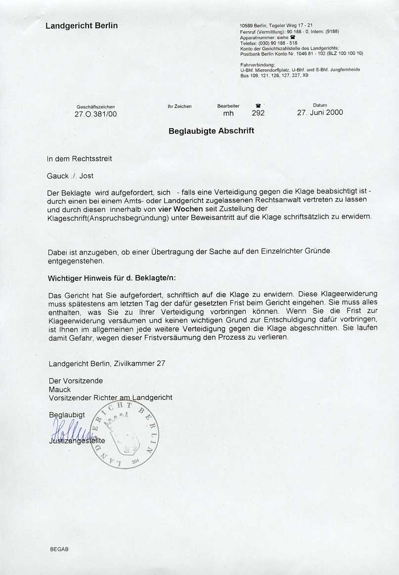 The following is a link to a copy of a court order from June 20, 2000 ordering me to pay 1.716 DM 90Pf to Joachim Gauck within two weeks or they will come knocking on my door for the money. Aus diesem Beschluss kann ohne weiteres die Zwangsvollstreckung betrieben werden...