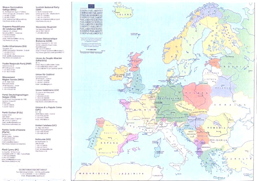 Urheber des Kartenwerks ist die ,,Demokratische Partei der Völker Europas" (Parti democratique des peuples d'Europe/PDPE), die in Brüssel gemeinsam mit den ,,Grünen" auftritt. Der Partei gehören Verbände an, deren Kontakt mit bekannten Vorfeldorganisationen der deutschen Außenpolitik seit den 1950er Jahren belegt ist, so die walisische ,,Plaid Cymru" (PC). Andere Verbände wie die ,,Partei der Deutschsprachigen Belgier" (PDB), die ,,Union für Südtirol" oder die ,,Friesische Nationalpartei" (FNP) sind Teil des deutschen Netzwerks einer ,,rassischen" (,,ethnischen") Neuordnung Europas. Der Blutsrassismus, der sich folkloristisch gibt und auch soziale Forderungen integriert, zielt auf die völlige Revision der kontinentalen Grenzgeschichte und sieht die Vorherrschaft der ,,Blutsdeutschen" in Europa vor.